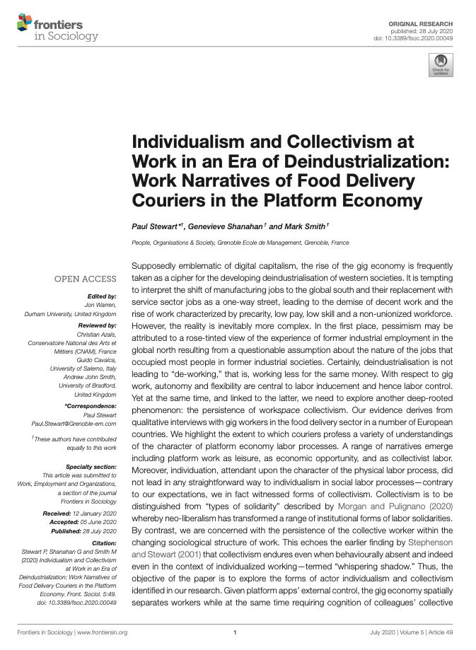 This study draws on qualitative interviews with gig workers in the food delivery sector, demonstrating workers’ multiple understandings of platform economy labour processes: as leisure, as economic opportunity, and as precarious labour. Moreover, while app-mediated platform work spatially separates workers, we also witnessed forms of collectivism among this population. Thus, the objective of the paper is to explore forms of actor individualism and collectivism amongst platform workers.