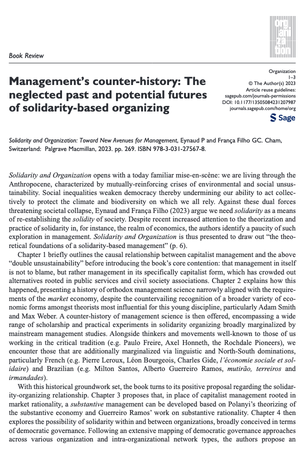 This is a short review of Solidarity and Organization: Toward New Avenues for Management by Philippe Eynaud and Genauto Carvalho de França Filho – a book that offers a valuable and “eclectic survey of marginalized and neglected subaltern inquiry,” along with signposts towards a number of important avenues for future research. Specifically, I highlight the interest of a) a post-human understanding of solidarity, and b) pragmatic approaches to the study of real utopias, informed by critical epistemology.