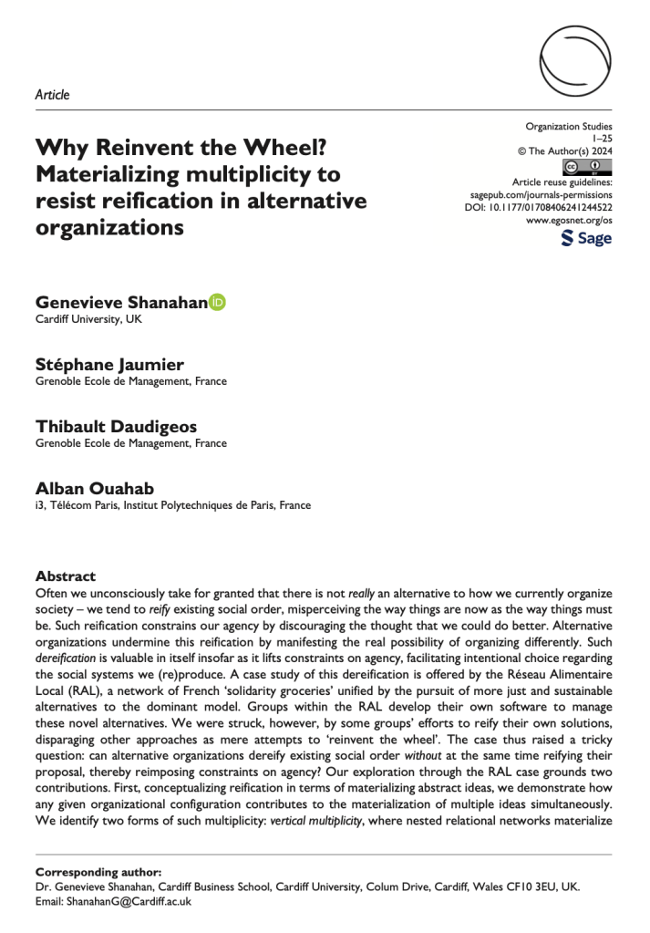 Shanahan, Genevieve, Jaumier, Stéphane, Daudigeos, Thibault and Ouahab, Alban. (2024). Why reinvent the wheel? Materializing multiplicity to resist reification in alternative organizations. Organization Studies.